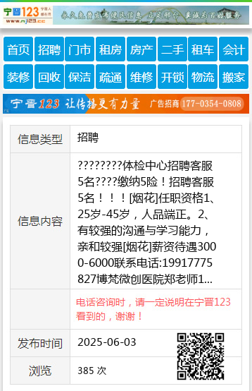 ????????体检中心招聘客服5名????缴纳5险!招聘客服5名!!![烟花]任职资格1、25岁-45岁,人品端正。2、有较强的沟通与学习能力,亲和较强[烟花]薪资待遇3000-6000联系电话:19917775827博梵微创医院郑老师15145806607 【电话咨询时,请一定说明在伊春信息网看到的,谢谢!】 |