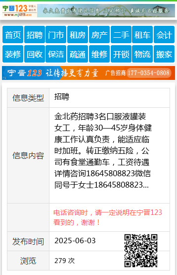 金北药招聘3名口服液罐装女工,年龄30—45岁身体健康工作认真负责,能适应临时加班。转正缴纳五险,公司有食堂通勤车,工资待遇详情咨询18645808823微信同号于女士18645808823