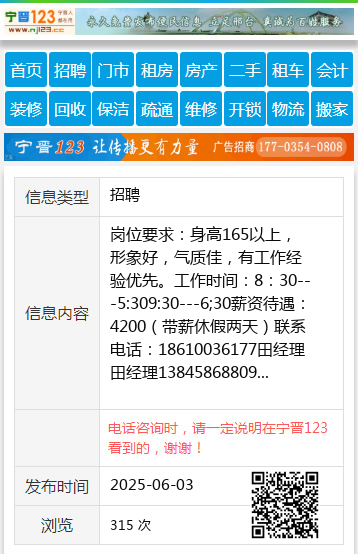 岗位要求:身高165以上,形象好,气质佳,有工作经验优先。工作时间:8:30---5:309:30---6;30薪资待遇:4200(带薪休假两天)联系电话:18610036177田经理田经理13845868809 【电话咨询时,请一定说明在伊春信息网看到的,谢谢!】 |
