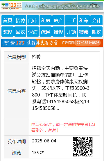 招聘全天内勤,主要负责快递分拣扫描简单装卸,工作轻松,要求身体健康无疾病史,55岁以下,工资3500-3800,中午休息时间长,联系电话13154585058极兔13154585058 【电话咨询时,请一定说明在伊春信息网看到的,谢谢!】 |