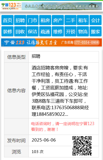 酒店招聘客房房嫂,要求:有工作经验,有责任心,干活干净利落,员工待遇:有工作餐,工资底薪加提成,地址:伊美区弘福花园,公交站:坐3路8路车三道街下车即可,联系电话:13763506888吴经理18845859022 【电话咨询时,请一定说明在伊春信息网看到的,谢谢!】 |