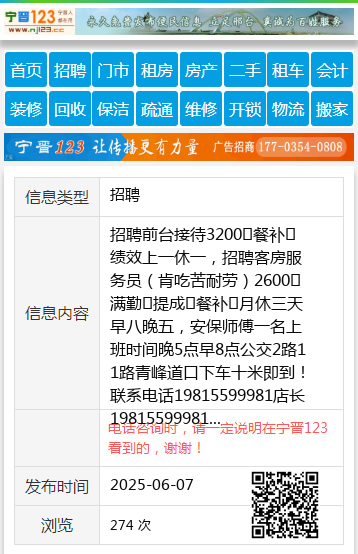 招聘前台接待3200➕餐补➕绩效上一休一,招聘客房服务员(肯吃苦耐劳)2600➕满勤➕提成➕餐补➕月休三天早八晚五,安保师傅一名上班时间晚5点早8点公交2路11路青峰道口下车十米即到!联系电话19815599981店长19815599981