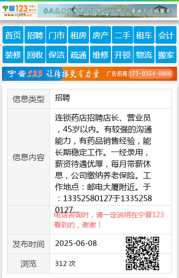 连锁药店招聘店长、营业员,45岁以内。有较强的沟通能力,有药品销售经验,能长期稳定工作。一经录用,薪资待遇优厚,每月带薪休息,公司缴纳养老保险。工作地点:邮电大厦附近。于:13352580127于13352580127 【电话咨询时,请一定说明在伊春信息网看到的,谢谢!】 |