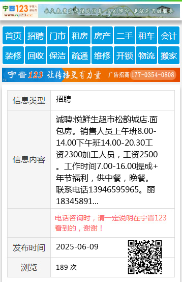 诚聘:悦鲜生超市松韵城店.面包房。销售人员上午班8.00-14.00下午班14.00-20.30工资2300加工人员,工资2500。工作时间7.00-16.00提成+年节福利,供中餐,晚餐。联系电话13946595965。丽18345891731