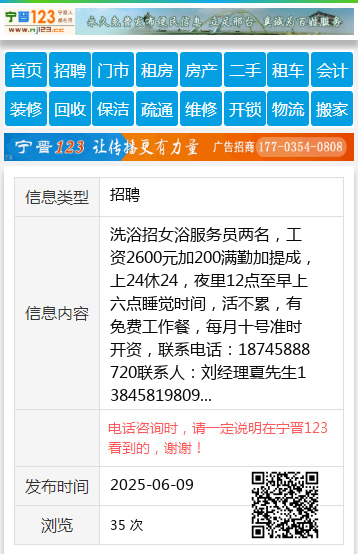 洗浴招女浴服务员两名,工资2600元加200满勤加提成,上24休24,夜里12点至早上六点睡觉时间,活不累,有免费工作餐,每月十号准时开资,联系电话:18745888720联系人:刘经理夏先生13845819809 【电话咨询时,请一定说明在伊春信息网看到的,谢谢!】 |