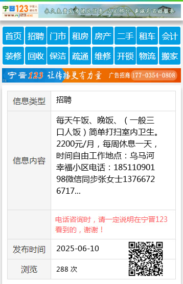 每天午饭、晚饭、(一般三口人饭)简单打扫室内卫生。2200元/月,每周休息一天,时间自由工作地点:乌马河幸福小区电话:18511090198微信同步张女士13766726717 【电话咨询时,请一定说明在伊春信息网看到的,谢谢!】 |