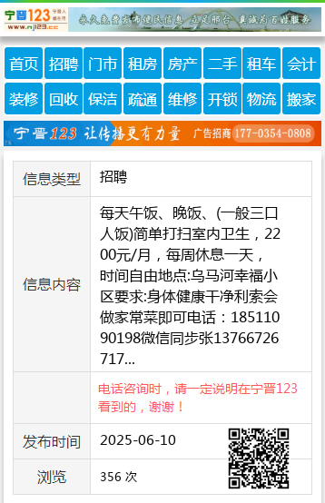 每天午饭、晚饭、(一般三口人饭)简单打扫室内卫生,2200元/月,每周休息一天,时间自由地点:乌马河幸福小区要求:身体健康干净利索会做家常菜即可电话:18511090198微信同步张13766726717 【电话咨询时,请一定说明在伊春信息网看到的,谢谢!】 |
