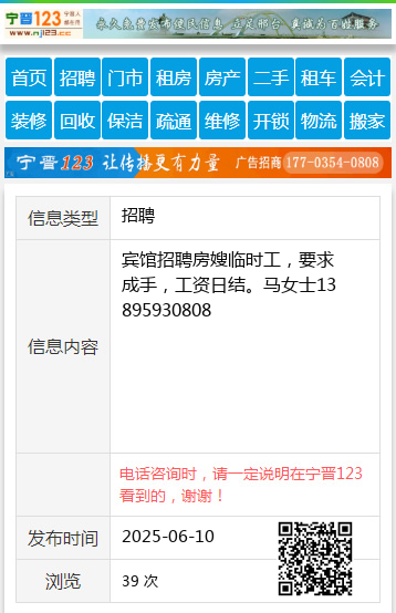 宾馆招聘房嫂临时工,要求成手,工资日结。马女士13895930808