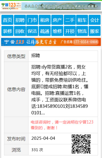 招聘:dy带货直播2名,男女均可,有无经验都可以,上镜的,带薪免费培训供吃住。底薪➕提成招聘:助播1名,懂电脑。招聘:直播运营1名,成手,工资面议联系微信电话:18345890101刘18345890101