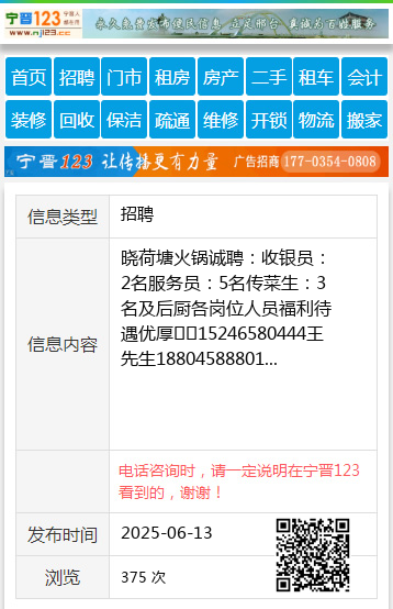 晓荷塘火锅诚聘:收银员:2名服务员:5名传菜生:3名及后厨各岗位人员福利待遇优厚☎️15246580444王先生18804588801 【电话咨询时,请一定说明在伊春信息网看到的,谢谢!】 |