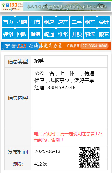 房嫂一名,上一休一,待遇优厚,老板事少,活好干李经理18304582346