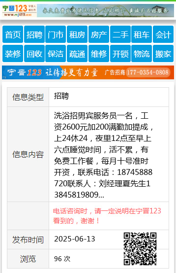 洗浴招男宾服务员一名,工资2600元加200满勤加提成,上24休24,夜里12点至早上六点睡觉时间,活不累,有免费工作餐,每月十号准时开资,联系电话:18745888720联系人:刘经理夏先生13845819809