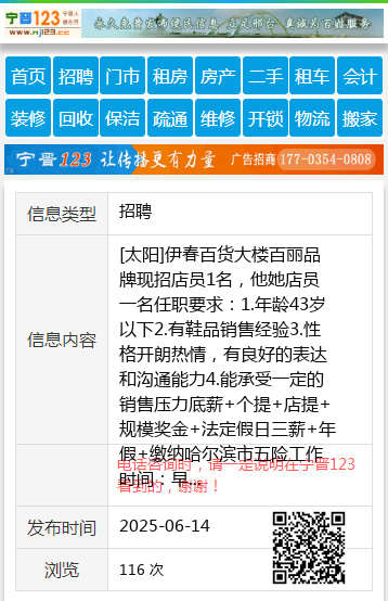 [太阳]伊春百货大楼百丽品牌现招店员1名,他她店员一名任职要求:1.年龄43岁以下2.有鞋品销售经验3.性格开朗热情,有良好的表达和沟通能力4.能承受一定的销售压力底薪+个提+店提+规模奖金+法定假日三薪+年假+缴纳哈尔滨市五险工作时间:早晚倒班,月休2天,每天工作7小时联系电话及微信18304500629沈女士18745890905 【电话咨询时,请一定说明在伊春信息网看到的,谢谢!】 |
