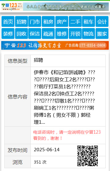 伊春市《和记馅饼诚聘》????????后厨女工2名????????前厅打菜员1名????????保洁员2名⏰钟点工2名????????????切墩1名????????刷碗工1名????????????粥师傅1名(男女不限)郭经理13089598966(微信同步)王经理13039661889(微信同步)郭经理13089598966 【电话咨询时,请一定说明在伊春信息网看到的,谢谢!】 |