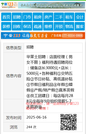 华莱士招聘:店面经理(男女不限)福利待遇招聘岗位:储备店长3000元+店长:5000元+各种福利①交纳五险②节日补贴、高低温补贴③节假日福利品④年假⑤婚假⑥产假/陪产假⑦直系丧假⑧员工团建日:每店每月288元⑨每年9月组织带薪5-7天旅游⑩参选全国级优秀员工表彰额外增收奖金①在职股②工龄奖③业绩奖风里雨里华莱士等你!!!????——华莱士(黑龙江区域)????要求:年龄18~55之间,可任意调配早晚班,长期稳定,有岗位意识以及责任心。有意者电话联系或面议地址:伊春步行街华莱士联系电话:13359666322微信同步崔立伟13359666322 【电话咨询时,请一定说明在伊春信息网看到的,谢谢!】 |