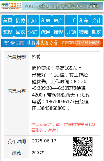 岗位要求:身高165以上,形象好,气质佳,有工作经验优先。工作时间:8:30---5:309:30---6;30薪资待遇:4200(带薪休假两天)联系电话:18610036177田经理田13845868809 【电话咨询时,请一定说明在伊春信息网看到的,谢谢!】 |