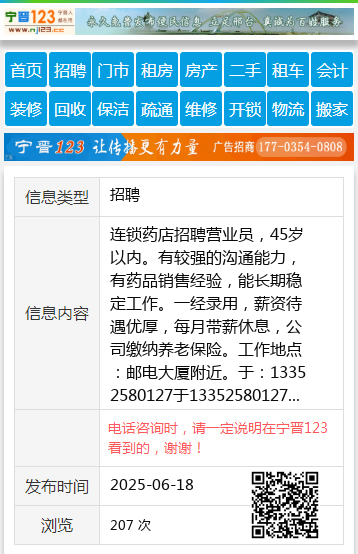 连锁药店招聘营业员,45岁以内。有较强的沟通能力,有药品销售经验,能长期稳定工作。一经录用,薪资待遇优厚,每月带薪休息,公司缴纳养老保险。工作地点:邮电大厦附近。于:13352580127于13352580127 【电话咨询时,请一定说明在伊春信息网看到的,谢谢!】 |