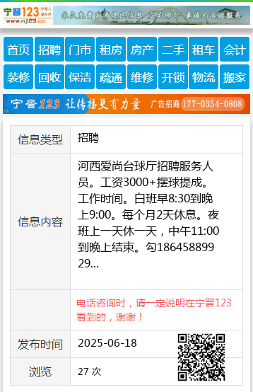 河西爱尚台球厅招聘服务人员。工资3000+摆球提成。工作时间。白班早8:30到晚上9:00。每个月2天休息。夜班上一天休一天,中午11:00到晚上结束。勾18645889929 【电话咨询时,请一定说明在伊春信息网看到的,谢谢!】 |