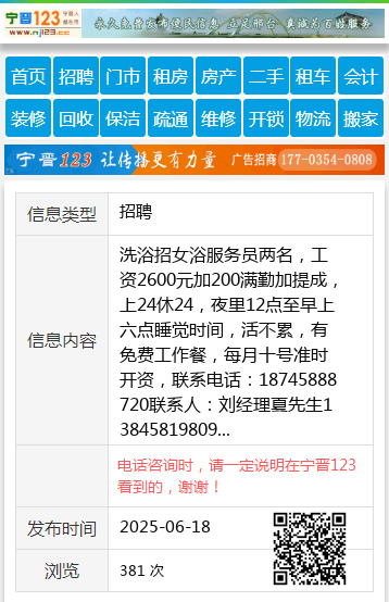 洗浴招女浴服务员两名,工资2600元加200满勤加提成,上24休24,夜里12点至早上六点睡觉时间,活不累,有免费工作餐,每月十号准时开资,联系电话:18745888720联系人:刘经理夏先生13845819809 【电话咨询时,请一定说明在伊春信息网看到的,谢谢!】 |