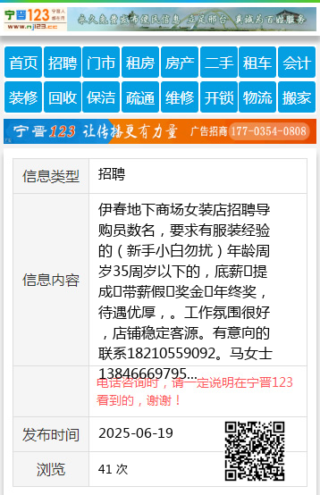 伊春地下商场女装店招聘导购员数名,要求有服装经验的(新手小白勿扰)年龄周岁35周岁以下的,底薪➕提成➕带薪假➕奖金➕年终奖,待遇优厚,。工作氛围很好,店铺稳定客源。有意向的联系18210559092。马女士13846669795 【电话咨询时,请一定说明在伊春信息网看到的,谢谢!】 |