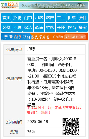 营业员一名:月收入4000-8000,工作时间:两班倒,早班8:00-14:30,晚班14:00-21:00,每班6.5小时左右福利待遇:每月带薪休假4天,年休假48天,法定假日3倍底薪,可缴纳社保岗位要求:18-30周岁,初中及以上学历,形象端正,身体健康,语言表达能力好,态度积极喻女士13045258778 【电话咨询时,请一定说明在伊春信息网看到的,谢谢!】 |