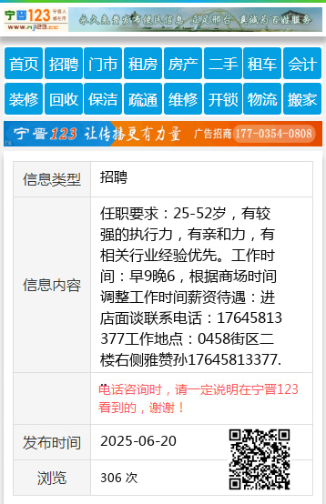 任职要求:25-52岁,有较强的执行力,有亲和力,有相关行业经验优先。工作时间:早9晚6,根据商场时间调整工作时间薪资待遇:进店面谈联系电话:17645813377工作地点:0458街区二楼右侧雅赞孙17645813377 【电话咨询时,请一定说明在伊春信息网看到的,谢谢!】 |