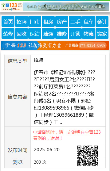 伊春市《和记馅饼诚聘》????????后厨女工2名????????前厅打菜员1名????????保洁员2名????????????粥师傅1名(男女不限)郭经理13089598966(微信同步)王经理13039661889(微信同步)王13039661889 【电话咨询时,请一定说明在伊春信息网看到的,谢谢!】 |