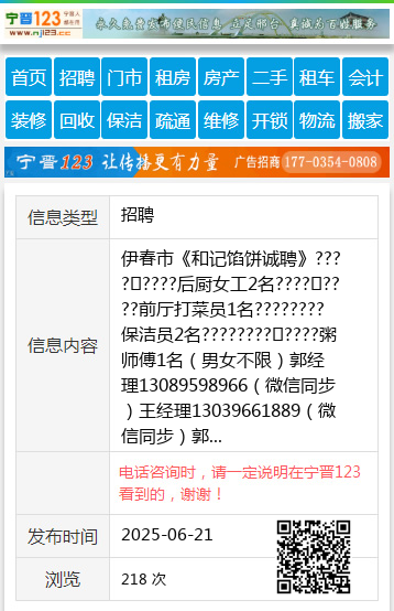伊春市《和记馅饼诚聘》????????后厨女工2名????????前厅打菜员1名????????保洁员2名????????????粥师傅1名(男女不限)郭经理13089598966(微信同步)王经理13039661889(微信同步)郭经理13089598966 【电话咨询时,请一定说明在伊春信息网看到的,谢谢!】 |