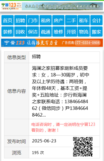 海澜之家招募家庭新成员要求:女,18—30周岁,初中及以上学历待遇:两班倒,年休假48天,基本工资+提奖+五险地址:步行街海澜之家联系电话:13846648462(微信同步)尹13846648462 【电话咨询时,请一定说明在伊春信息网看到的,谢谢!】 |