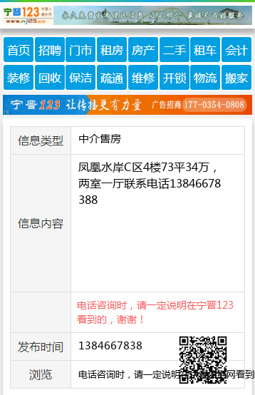 凤凰水岸C区4楼73平34万,两室一厅联系电话13846678388