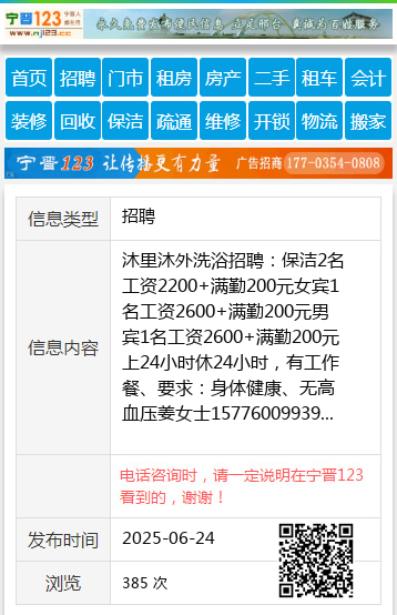 沐里沐外洗浴招聘:保洁2名工资2200+满勤200元女宾1名工资2600+满勤200元男宾1名工资2600+满勤200元上24小时休24小时,有工作餐、要求:身体健康、无高血压姜女士15776009939 【电话咨询时,请一定说明在伊春信息网看到的,谢谢!】 |