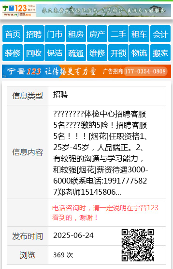 ????????体检中心招聘客服5名????缴纳5险!招聘客服5名!!![烟花]任职资格1、25岁-45岁,人品端正。2、有较强的沟通与学习能力,和较强[烟花]薪资待遇3000-6000联系电话:19917775827郑老师15145806607 【电话咨询时,请一定说明在伊春信息网看到的,谢谢!】 |