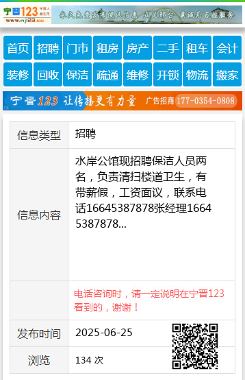 水岸公馆现招聘保洁人员两名,负责清扫楼道卫生,有带薪假,工资面议,联系电话16645387878张经理16645387878 【电话咨询时,请一定说明在伊春信息网看到的,谢谢!】 |