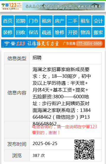 海澜之家招募家庭新成员要求:女,18—30周岁,初中及以上学历待遇:半天班+月休4天+基本工资+提奖+五险薪资:3800——6000地址:步行街沪上阿姨奶茶对面海澜之家联系电话:13846648462(微信同步)尹13846648462 【电话咨询时,请一定说明在伊春信息网看到的,谢谢!】 |