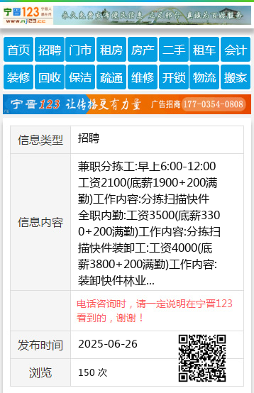 兼职分拣工:早上6:00-12:00工资2100(底薪1900+200满勤)工作内容:分拣扫描快件全职内勤:工资3500(底薪3300+200满勤)工作内容:分拣扫描快件装卸工:工资4000(底薪3800+200满勤)工作内容:装卸快件林业局司机:B证司机工资5000(底薪4800+200满勤)要求:无重大疾病脑梗心梗心脏病等工作地点:七公里辽西物流西侧,水岸公馆南环红绿灯新峰建筑材料公司院内。求职拨打此联系电话:13766789712王经理18345877570 【电话咨询时,请一定说明在伊春信息网看到的,谢谢!】 |