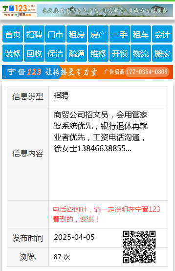 商贸公司招文员,会用管家婆系统优先,银行退休再就业者优先,工资电话沟通,徐女士13846638855