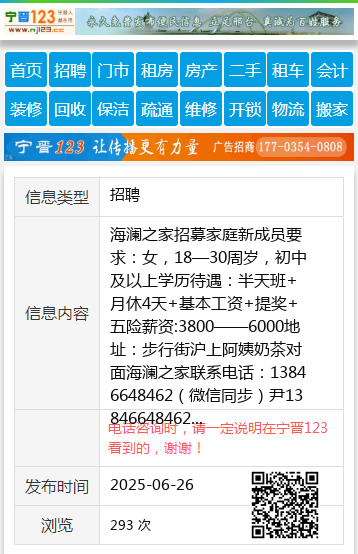 海澜之家招募家庭新成员要求:女,18—30周岁,初中及以上学历待遇:半天班+月休4天+基本工资+提奖+五险薪资:3800——6000地址:步行街沪上阿姨奶茶对面海澜之家联系电话:13846648462(微信同步)尹13846648462 【电话咨询时,请一定说明在伊春信息网看到的,谢谢!】 |