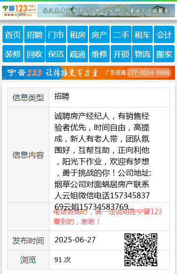 诚聘房产经纪人,有销售经验者优先,时间自由,高提成,新人有老人带,团队氛围好,互帮互助,正向利他,阳光下作业,欢迎有梦想,勇于挑战的你!公司地址:烟草公司对面蜗居房产联系人云姐微信电话15734583769云姐15734583769 【电话咨询时,请一定说明在伊春信息网看到的,谢谢!】 |