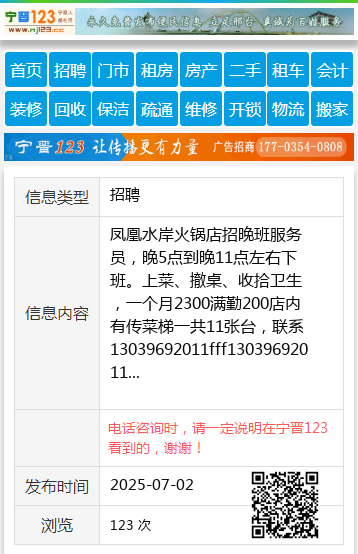 凤凰水岸火锅店招晚班服务员,晚5点到晚11点左右下班。上菜、撤桌、收拾卫生,一个月2300满勤200店内有传菜梯一共11张台,联系13039692011fff13039692011