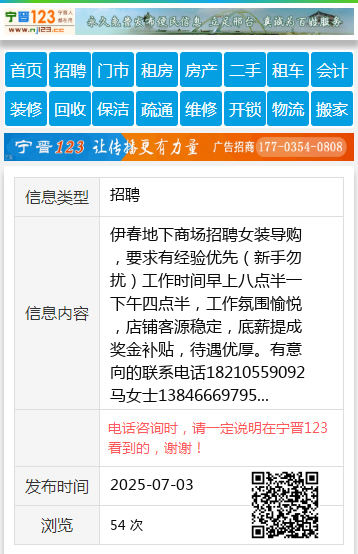 伊春地下商场招聘女装导购,要求有经验优先(新手勿扰)工作时间早上八点半一下午四点半,工作氛围愉悦,店铺客源稳定,底薪提成奖金补贴,待遇优厚。有意向的联系电话18210559092马女士13846669795 【电话咨询时,请一定说明在伊春信息网看到的,谢谢!】 |
