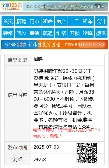 男装招聘年龄20~30周岁工资待遇:底薪+提成+两班倒(半天班)+节假日三薪+每月带薪休假4天+五险,月薪3800~6000上不封顶,入职免费回公司参观学习,团队氛围好优秀员工逐级晋升,机会多,名额有限,机会难得,有意者速报名电话:13846648462尹13846648462 【电话咨询时,请一定说明在伊春信息网看到的,谢谢!】 |