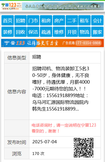 招聘司机、物流装卸工5名30-50岁,身体健康,无不良嗜好,待遇优厚,月薪4000-7000元期待您的加入!!电话:15561918899地址:乌马河汇源国际物流园院内韩先生15561918899 【电话咨询时,请一定说明在伊春信息网看到的,谢谢!】 |