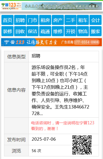 游乐场设备操作员2名,年龄不限,可全职(下午14点到晚上10点)也可小时工(下午17点到晚上21点),主要负责设备的运行、收摊工作、人员引导、秩序维护、确保安全。王先生13846672728