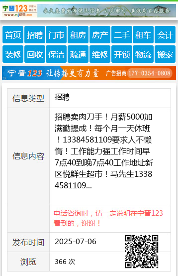 招聘卖肉刀手!月薪5000加满勤提成!每个月一天休班!13384581109要求人不懒惰!工作能力强工作时间早7点40到晚7点40工作地址新区悦鲜生超市!马先生13384581109 【电话咨询时,请一定说明在伊春信息网看到的,谢谢!】 |