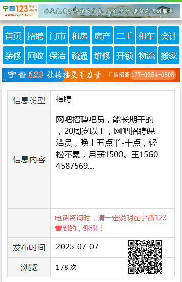 网吧招聘吧员,能长期干的,20周岁以上,网吧招聘保洁员,晚上五点半-十点,轻松不累,月薪1500。王15604587569 【电话咨询时,请一定说明在伊春信息网看到的,谢谢!】 |