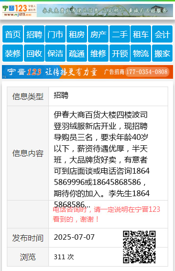 伊春大商百货大楼四楼波司登羽绒服新店开业,现招聘导购员三名,要求年龄40岁以下,薪资待遇优厚,半天班,大品牌货好卖,有意者可到店面谈或电话咨询18645869996或18645868586,期待你的加入。李先生18645868586 【电话咨询时,请一定说明在伊春信息网看到的,谢谢!】 |