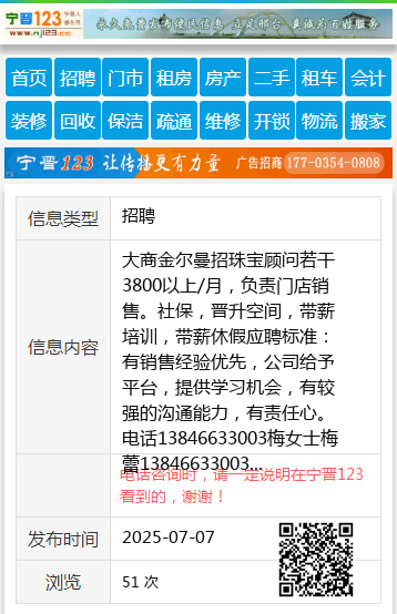 大商金尔曼招珠宝顾问若干3800以上/月,负责门店销售。社保,晋升空间,带薪培训,带薪休假应聘标准:有销售经验优先,公司给予平台,提供学习机会,有较强的沟通能力,有责任心。电话13846633003梅女士梅蕾13846633003 【电话咨询时,请一定说明在伊春信息网看到的,谢谢!】 |