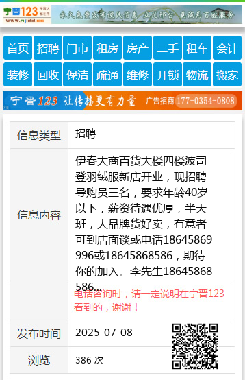 伊春大商百货大楼四楼波司登羽绒服新店开业,现招聘导购员三名,要求年龄40岁以下,薪资待遇优厚,半天班,大品牌货好卖,有意者可到店面谈或电话18645869996或18645868586,期待你的加入。李先生18645868586 【电话咨询时,请一定说明在伊春信息网看到的,谢谢!】 |