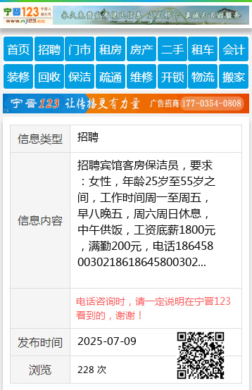 招聘宾馆客房保洁员,要求:女性,年龄25岁至55岁之间,工作时间周一至周五,早八晚五,周六周日休息,中午供饭,工资底薪1800元,满勤200元,电话1864580030218618645800302