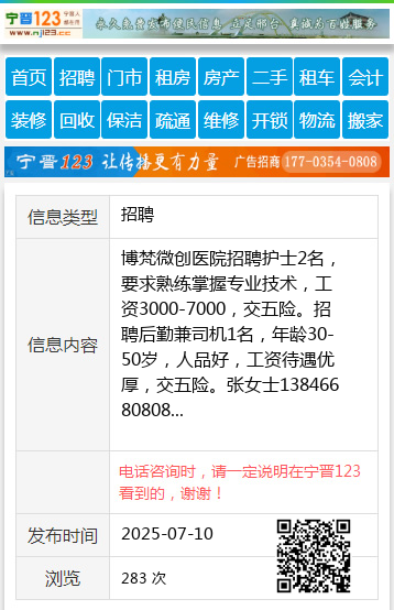 博梵微创医院招聘护士2名,要求熟练掌握专业技术,工资3000-7000,交五险。招聘后勤兼司机1名,年龄30-50岁,人品好,工资待遇优厚,交五险。张女士13846680808 【电话咨询时,请一定说明在伊春信息网看到的,谢谢!】 |